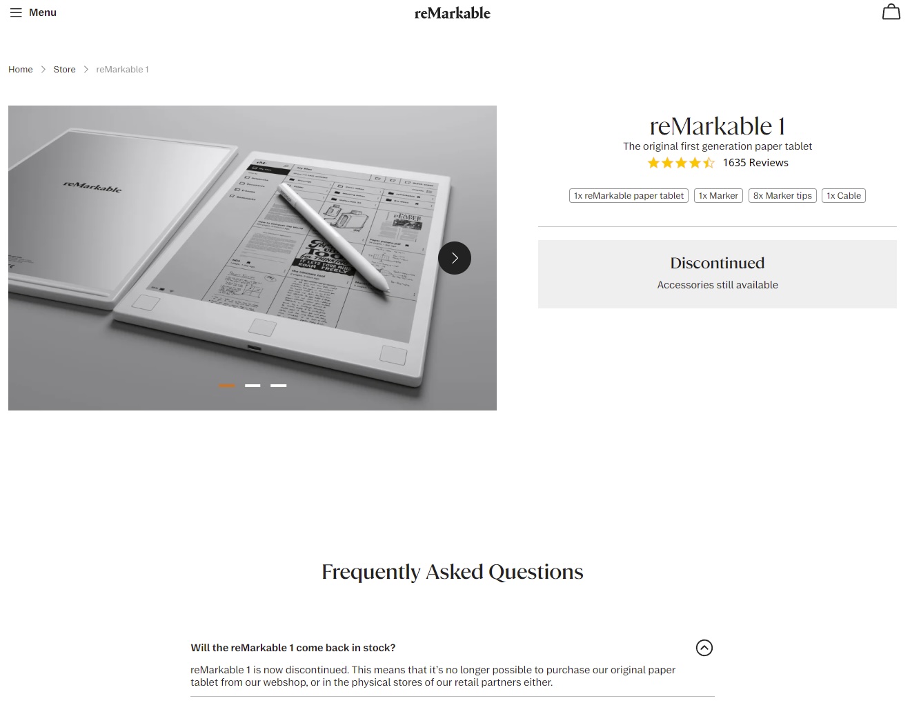 If your product is sold out and will remain so, communicate this very clearly. And proactively answer any questions that may arise. For example, Remarkable offers an FAQ on the product page of its first e-paper tablet.