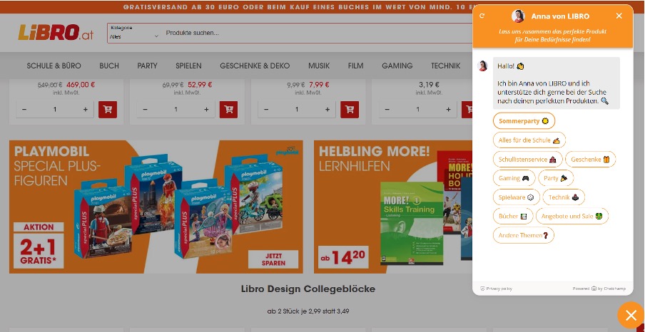 Example: There is a chatbot integrated on the Libro.at website that helps you find the products you want.