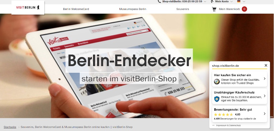 Example: The visitBerlin.de online shop relies on Trusted Shops. If you click on the emblem, which is floating on the right-hand side, a popup opens with further information.