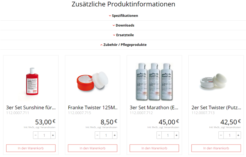 Abb. 2: B2C-Shop von FRANKE: Passende Pflegeprodukte auf der Produktdetailseite einer Spüle.