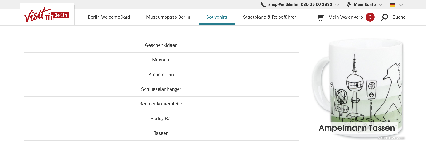 Um diese Herausforderung meistern zu können, entschied sich visitBerlin 2013 dazu, einen Online-Shop ins Leben zu rufen, um Touristen einen einfachen Zugang zu den verschiedenen Angeboten der Stadt anzubieten. Egal ob Museumspass, Stadtplan oder Reiseführer: Auf der Online-Plattform von visitBerlin wird jeder Berlin-Fan fündig. Ein breites Spektrum an Souvenirs, darunter Schlüsselanhänger, Magnete und Co., trägt außerdem dazu bei, dass die Besucher noch lange Zeit an ihr persönliches Berlin-Erlebnis zurückdenken und direkt ihren nächsten Aufenthalt in der Stadt planen.