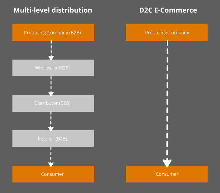 - In practice, however, D2C means: your company has to develop its own marketing and sales strategy and implement suitable measures to reach consumers directly. This can be very costly and time-consuming. Especially since you have to build up know-how internally in the form of new specialists.